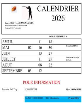 Avec l'aide de la municipalité, des sponsors et de tous les bénévoles, le Club organise une journée ball-trap (buvette et restauration ouverte à tout le monde avec un concours au mois de juin ou juillet (voir calendrier) ouvert à tous ses membres et dans une ambiance conviviale.